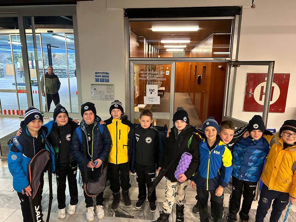 V pátek 5.1. jsme vyjeli na náš první letošní turnaj do Prahy. Vlakem nás doprovázela přípravka, se kterou jsme měli společné spaní v baletních sálech nedaleko haly. Večer byl ve znamení zábavy. Bylo těžké dosáhnout vysněného klidu a spánku. Na sobotu nám byl rozlosovaný zápas až na 15:30. Těšili jsme se, že ráno můžeme spát. Nezáviděli jsme našim dočasným spolubydlícím, že musí vstávat na ranní zápas. Co čert nechtěl, všichni vstávali už o půl 7. Takže budík, který měli trenéři nastavený zvonil při našem odchodu do haly na snídani. Stihli jsme začátek zápasu přípravky a celý den trávili s nimi na hale. Konečně přišla naše hodina. Prvním soupeřem byla Mladá Boleslav. Po pečlivé rozcvičce jsme nevídaným výkonem vyhráli 6:2. V tomto zápase fungovalo snad vše. Další zápas nás čekal proti Brnu v 18:00. Hra na hřištích se trošku zrychlila a my začínali o něco dřív. Tento zápas pro nás neskončil šťastně. Drželi jsme krok, ale soupeř nás postupně přehrál. Náš problém, a to nejen v tomto zápase byla produktivita. Nakonec jsme podlehli 6:0. I tak si myslím, že co do kvality se týče, to byl povedený zápas. Poté následoval rychlý přesun do haly Jahodovky. Zde jsme uhráli remízu s Plzeňskými Gorilami. Těšili jsme se na ubytko na spánek. Kluci vypadali unaveně, ale po příjezdu a večeři to z nich spadlo. Proběhla večerní zábava. Na druhý den jsme měli poslední zápas skupiny stanovený čas v 8 ráno. Budíček už neprobíhal, tak dobře. Bylo vidět, že jsou unavení. Po příchodu do haly následovala rozcvička, rozchytání a už se pískalo buly. Utkání bylo radostné pro soupeře z Tigers Praha. Poté jsme hráli ještě 2 zápasy. Jeden na hale Jahodovka, kde jsme prohráli 7:2 proti Hodonínu a posledním soupeřem byl Trenčín. S tím jsme padli v poměru 1:10. Neobešlo se to bez slz.