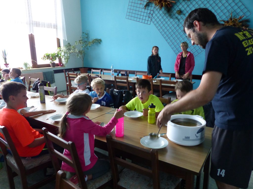 Následoval přesun do haly a první ze čtyř tréninkových jednotek. Hrál se florbal, ke svačině byla broskev a v poledne se všichni těšili na oběd.