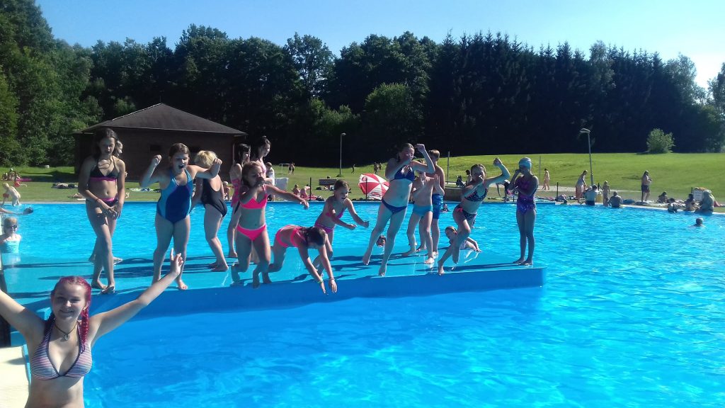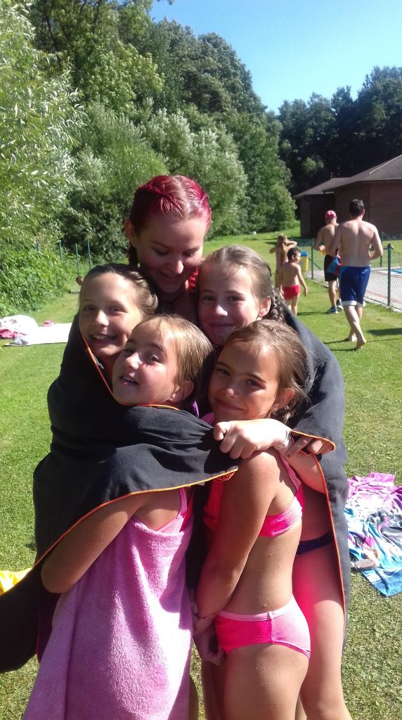 Potom rovnou následovala večeře, knedlíky se zelím a uzeným masem, padly i rekordy jako sedm snězených knedlíků. S plnými břichy se pak starší holky vypravily na koupaliště, kde většina trénovala skoky do vody nebo plážový volejbal, Adélka Klementová všechny vyprankovala a házela nás do vody i v oblečení. Mladší byly na hřišti a hrály různé hry.