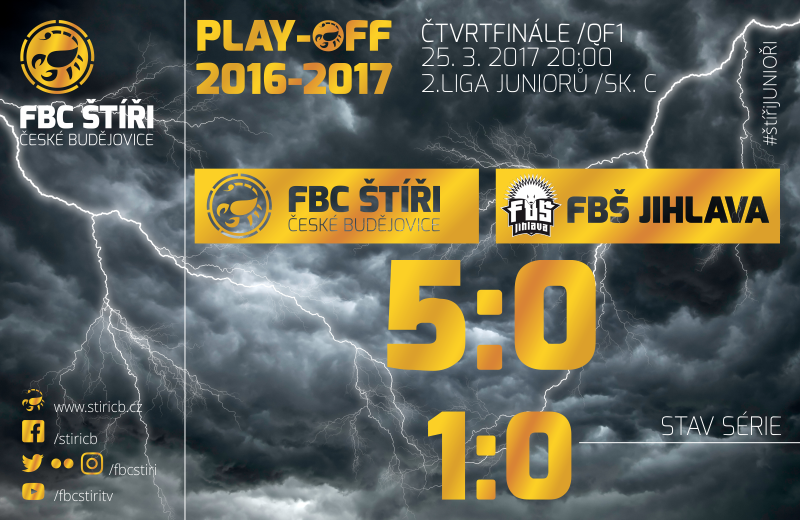 Skvěle! Junioři první utkání play off proti FBŠ Jihlava naprosto dominovali a zápas bezpečně dovedli do vítězného konce. Výsledek 5:0.