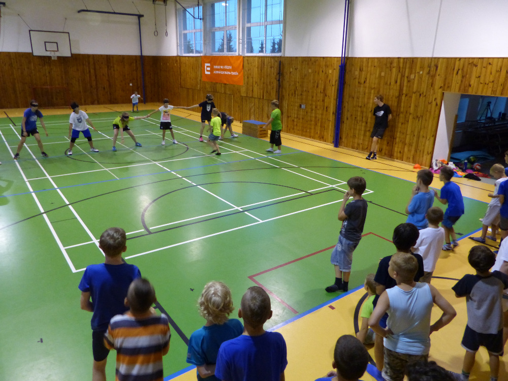 Odpoledne za mírného deště následoval přesun do haly, kde se hráči opět zdokonalovali v individuálních činnostech a hře. Tým dívek, který bydlí na základní škole s tělocvičnou, se nikam přesouvat nemusel a dívky se tak mohly věnovat o to více florbalu. Dokonce ve hře dva na jednoho dokázali porazit trenéra Honzu Novotného.