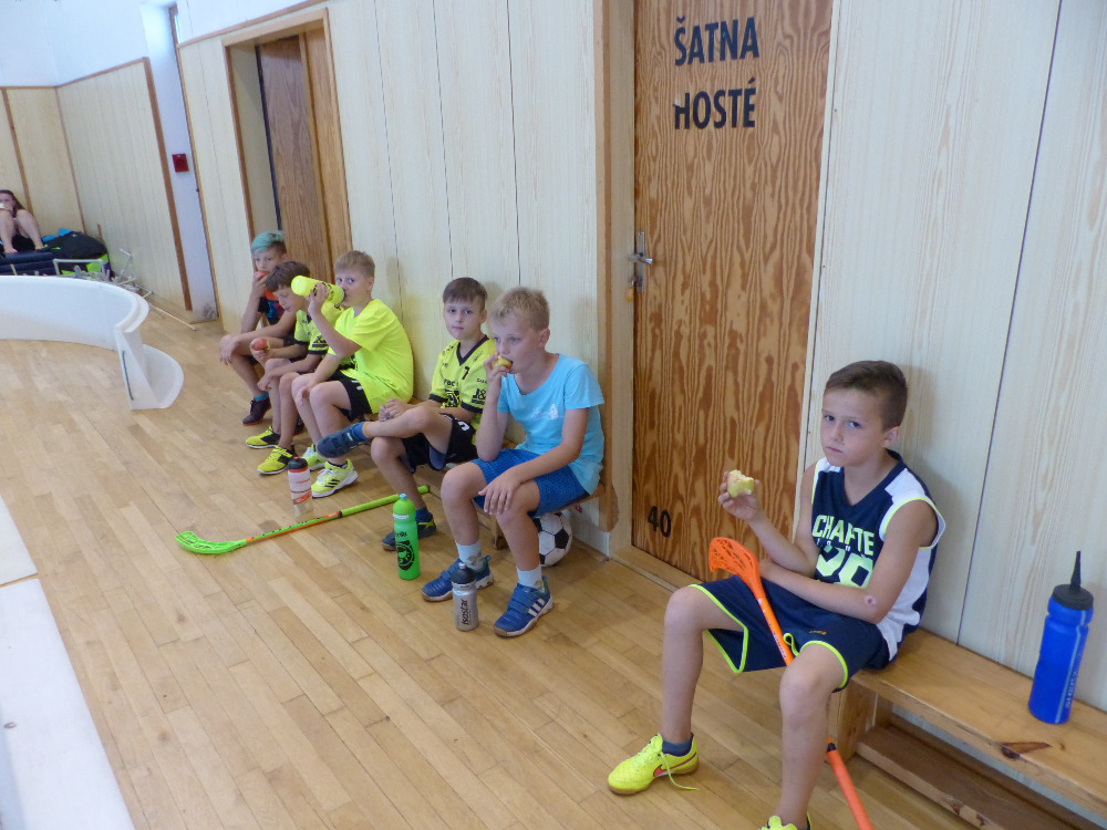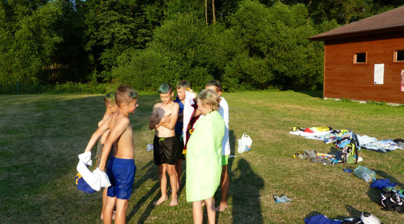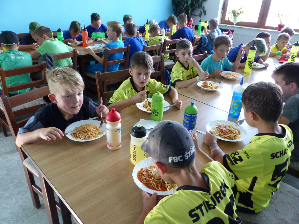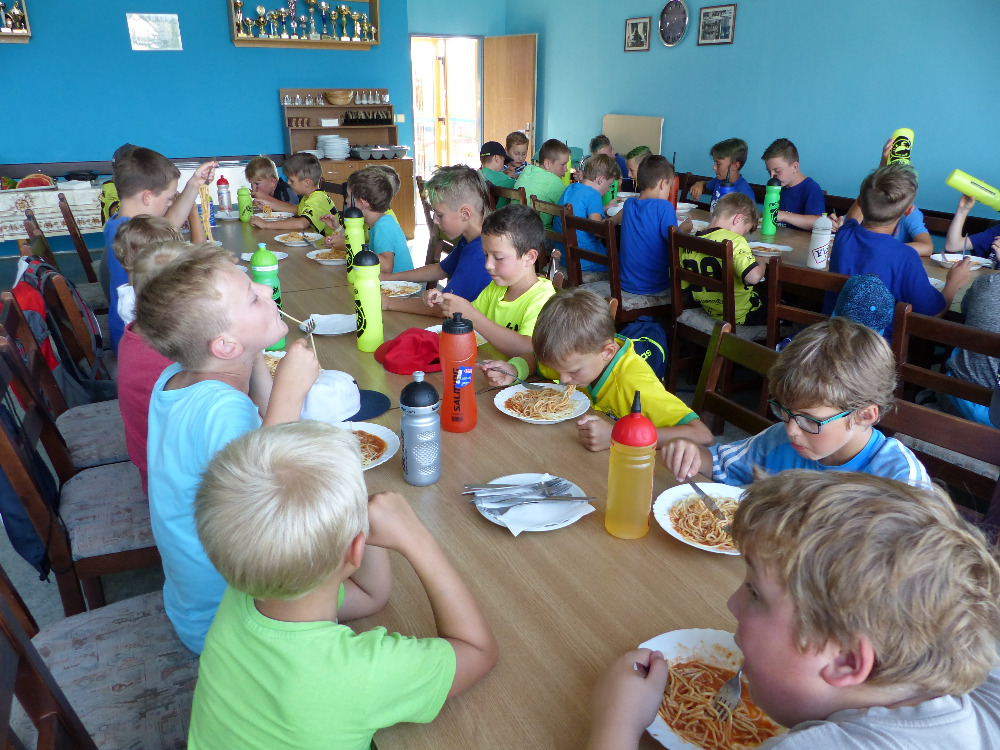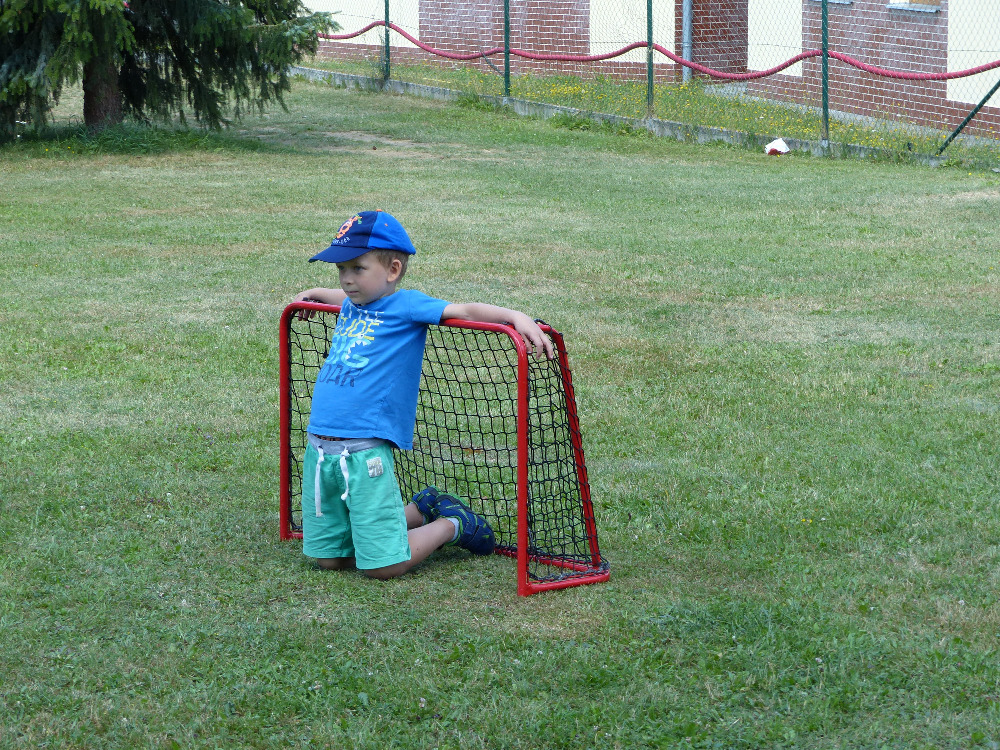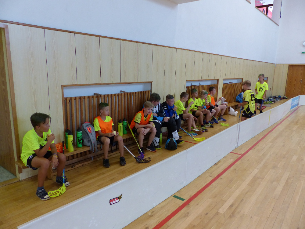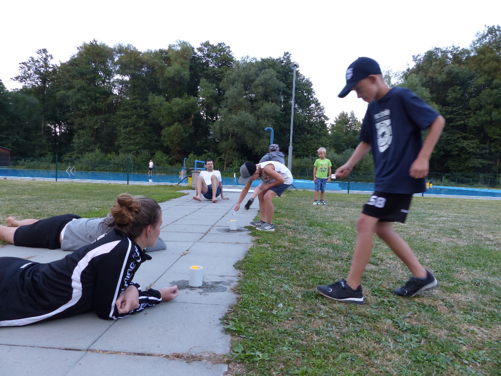 Přesně v 7.30 zazvonil budík, aby načal druhý den soustředění, ale to už byli stejně všichni vzhůru. K snídani se podával výtečný hornostropnický chléb s marmeládou či hnědou pomazánkou, podle chuti. Vydatně posilněni a namazáni opalovacím krémem vyrazili mladí Štíři na trénink. Dopolední dvě fáze rozdělené pauzou na nektarinku probíhaly venku a hráči opět okusili mix kolektivních sportů a koordinačních cvičení. Za velmi teplého dne bylo nutné dodržovat zavodňování, které pak hráči dopřávali i smrčkům v areálu místní školy. K obědu se tentokrát podával brambor zalitý máslem a sekaná, kterou trenérka Nikča, mimojiné zkušená pracovnice v gastru, vyšperkovala červeným a žlutým sósem. Trénéři pak odvedli své svěřence na ubikaci a cestou doufali, že sportovci budou alespoň trochu unaveni. Dvacet minut k naprosté regeneraci stačilo… Přesto Štíři vydrželi ve svých pokojích (a pokoje to vydrželi také, až na jedny vysazený dveře…) až do půl třetí. Poté na ně čekali dvě tréninkové jednotky v hale, aby vytříbili své florbalové dovednosti. Trenéři jim nedali nic zadarmo a po poctivě odvedených hodinách opět všichni usedli k jídelnímu stolu k večeři. Po špagetách se v leckterých talířech sotva zaprášilo, jinde jich zůstalo více, ale o to dříve přišly dotazy na druhou večeři. Jeden z trenérů, který se jmenuje Dan, poznamenal, že to sluníčko a špagety mu připomínají dovolenou v Itálii. O poznání čerstvější trenéři ho v této představě nechali, ale o dovolené mají jinou představu, než že kolem nich pobíhá 35 neúnavných svišťů. Nicméně i tak se kompletní ekipa přesunula vpodvečer na koupaliště. S určitostí lze říci, že voda tentokrát měla více, než je bod mrazu, což přímo vybízelo k vodním hrátkám. Prvotní pokyn: „koupeme se jen v malém bazénu a žádné skákání“ se tak ve finále proměnil na „hodíme do vody Nikču, případně Juru“. Nutno přiznat, že mladí Štíři projevili kolektivního ducha a snažili se dosáhnout díla společně, což se jim nakonec i podařilo. Den zakončil další díl etapové hry, druhá večeře, sprcha a spánek. Ve středu nás čeká odpočinkový den – dopolední výlet a odpoledne strávené u místního koupaliště.