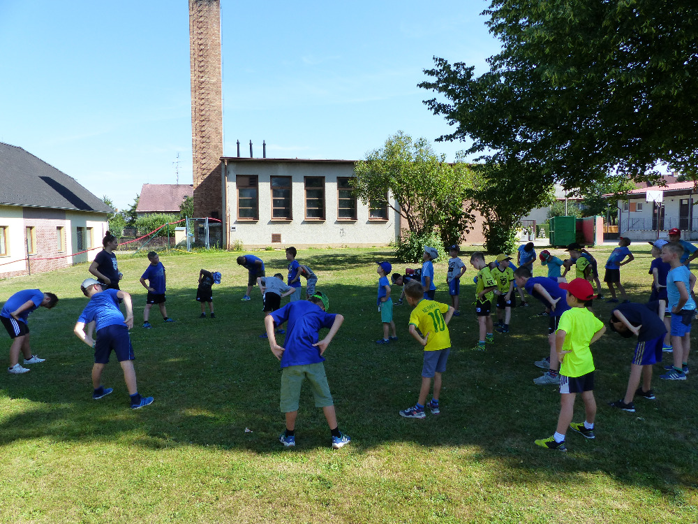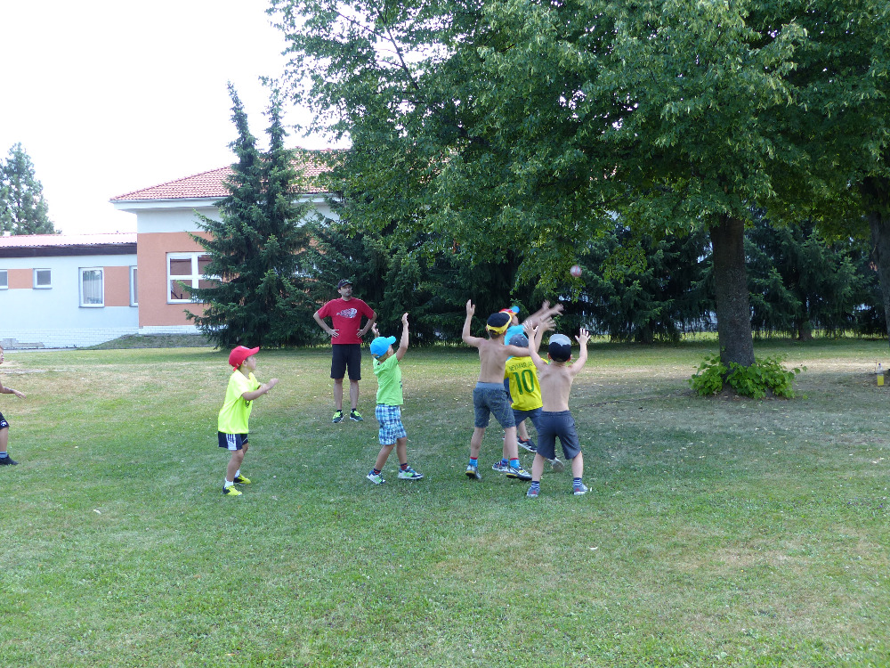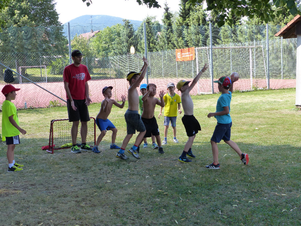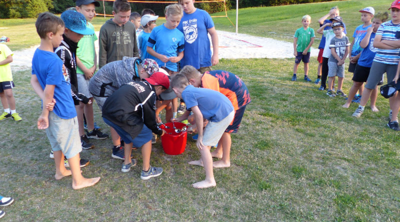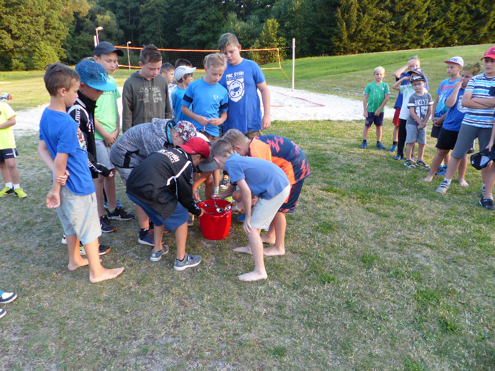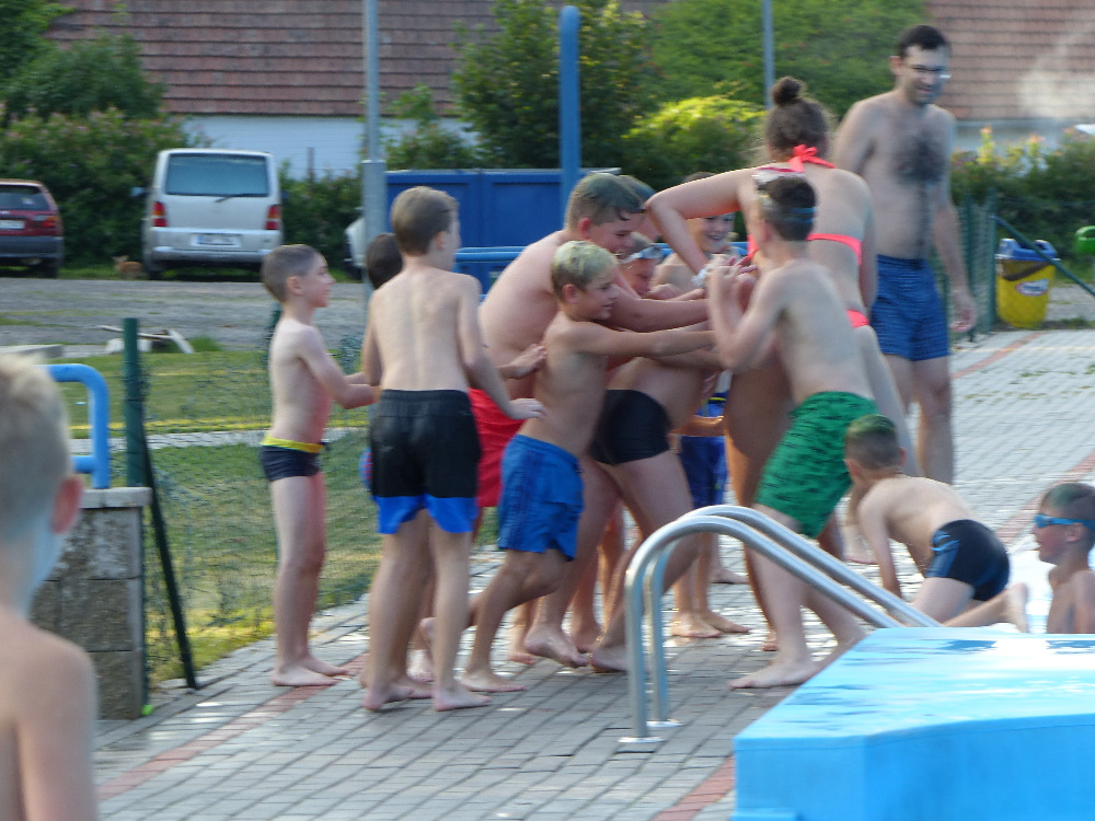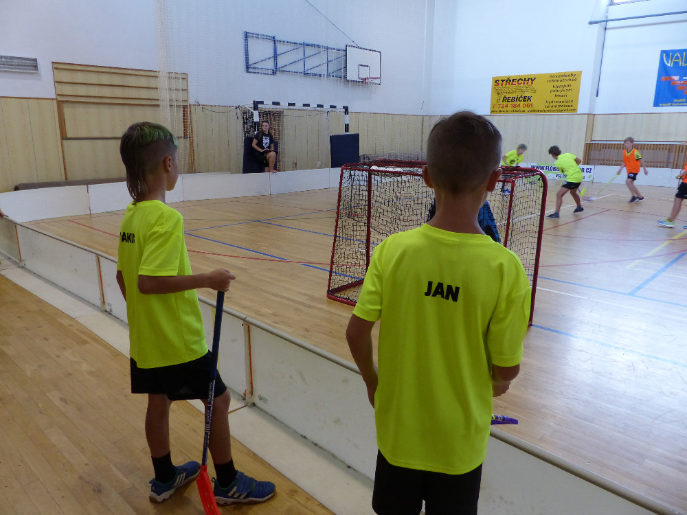 Přesně v 7.30 zazvonil budík, aby načal druhý den soustředění, ale to už byli stejně všichni vzhůru. K snídani se podával výtečný hornostropnický chléb s marmeládou či hnědou pomazánkou, podle chuti. Vydatně posilněni a namazáni opalovacím krémem vyrazili mladí Štíři na trénink. Dopolední dvě fáze rozdělené pauzou na nektarinku probíhaly venku a hráči opět okusili mix kolektivních sportů a koordinačních cvičení. Za velmi teplého dne bylo nutné dodržovat zavodňování, které pak hráči dopřávali i smrčkům v areálu místní školy. K obědu se tentokrát podával brambor zalitý máslem a sekaná, kterou trenérka Nikča, mimojiné zkušená pracovnice v gastru, vyšperkovala červeným a žlutým sósem. Trénéři pak odvedli své svěřence na ubikaci a cestou doufali, že sportovci budou alespoň trochu unaveni. Dvacet minut k naprosté regeneraci stačilo… Přesto Štíři vydrželi ve svých pokojích (a pokoje to vydrželi také, až na jedny vysazený dveře…) až do půl třetí. Poté na ně čekali dvě tréninkové jednotky v hale, aby vytříbili své florbalové dovednosti. Trenéři jim nedali nic zadarmo a po poctivě odvedených hodinách opět všichni usedli k jídelnímu stolu k večeři. Po špagetách se v leckterých talířech sotva zaprášilo, jinde jich zůstalo více, ale o to dříve přišly dotazy na druhou večeři. Jeden z trenérů, který se jmenuje Dan, poznamenal, že to sluníčko a špagety mu připomínají dovolenou v Itálii. O poznání čerstvější trenéři ho v této představě nechali, ale o dovolené mají jinou představu, než že kolem nich pobíhá 35 neúnavných svišťů. Nicméně i tak se kompletní ekipa přesunula vpodvečer na koupaliště. S určitostí lze říci, že voda tentokrát měla více, než je bod mrazu, což přímo vybízelo k vodním hrátkám. Prvotní pokyn: „koupeme se jen v malém bazénu a žádné skákání“ se tak ve finále proměnil na „hodíme do vody Nikču, případně Juru“. Nutno přiznat, že mladí Štíři projevili kolektivního ducha a snažili se dosáhnout díla společně, což se jim nakonec i podařilo. Den zakončil další díl etapové hry, druhá večeře, sprcha a spánek. Ve středu nás čeká odpočinkový den – dopolední výlet a odpoledne strávené u místního koupaliště.