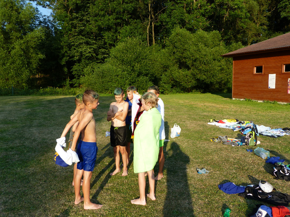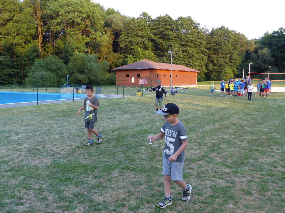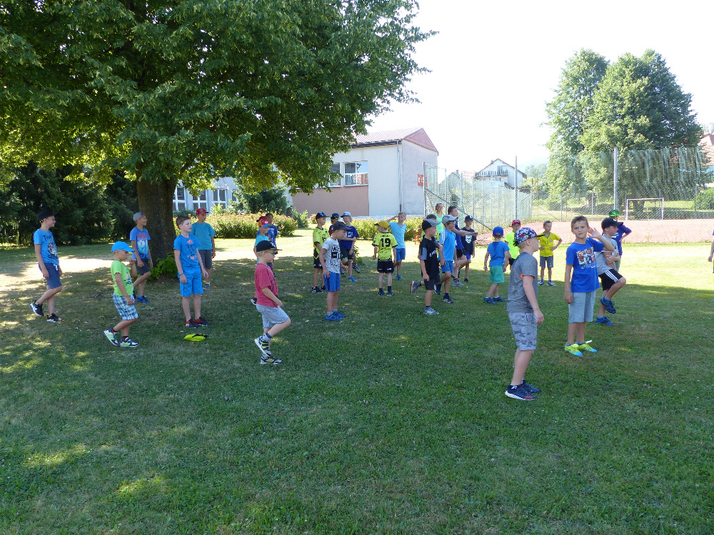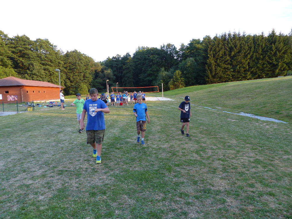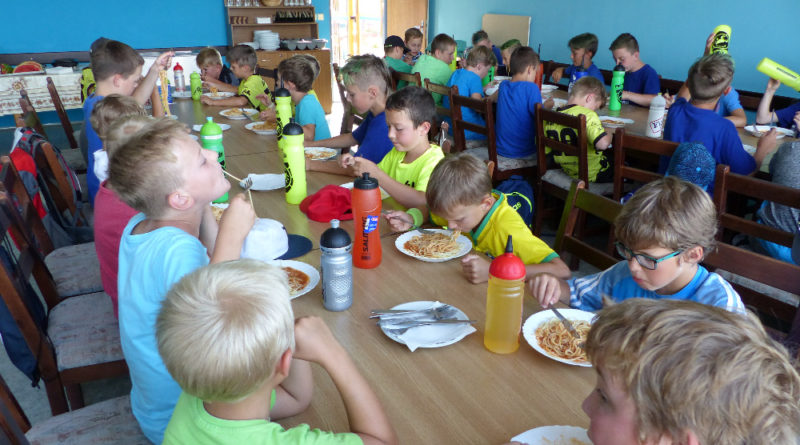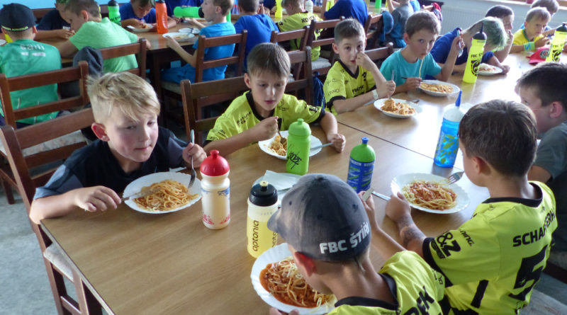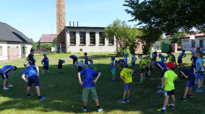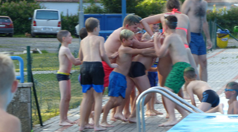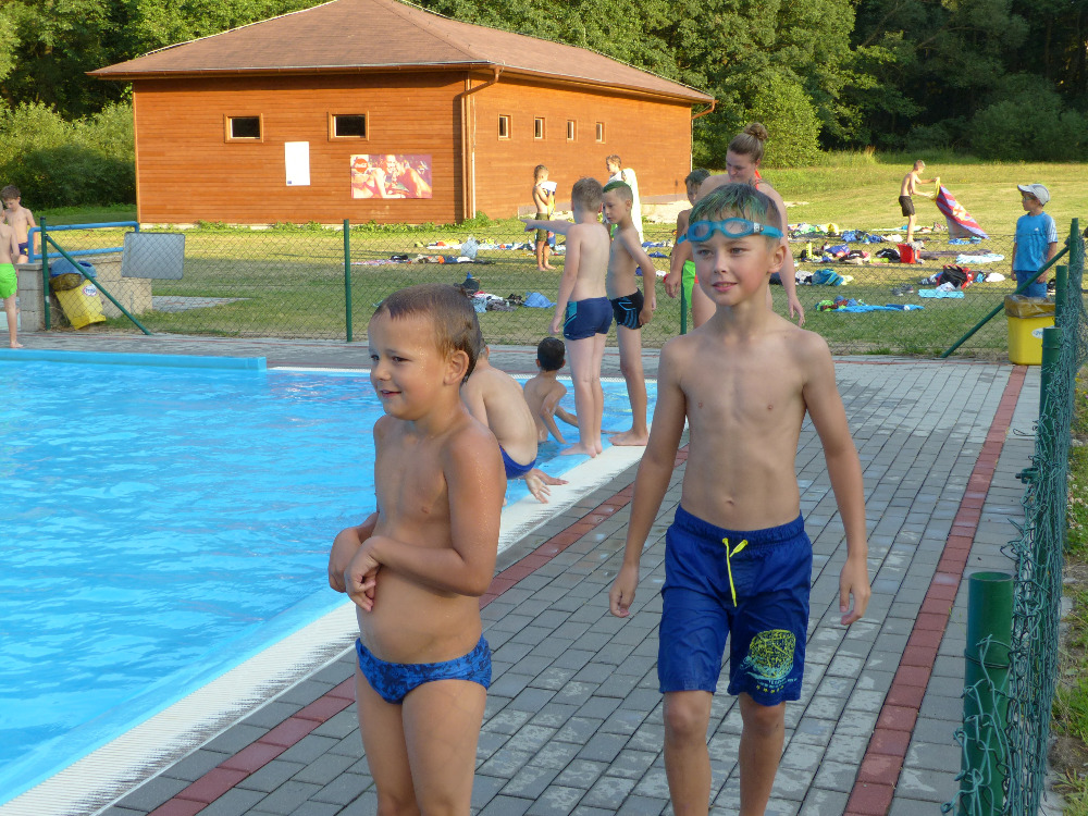 Přesně v 7.30 zazvonil budík, aby načal druhý den soustředění, ale to už byli stejně všichni vzhůru. K snídani se podával výtečný hornostropnický chléb s marmeládou či hnědou pomazánkou, podle chuti. Vydatně posilněni a namazáni opalovacím krémem vyrazili mladí Štíři na trénink. Dopolední dvě fáze rozdělené pauzou na nektarinku probíhaly venku a hráči opět okusili mix kolektivních sportů a koordinačních cvičení. Za velmi teplého dne bylo nutné dodržovat zavodňování, které pak hráči dopřávali i smrčkům v areálu místní školy. K obědu se tentokrát podával brambor zalitý máslem a sekaná, kterou trenérka Nikča, mimojiné zkušená pracovnice v gastru, vyšperkovala červeným a žlutým sósem. Trénéři pak odvedli své svěřence na ubikaci a cestou doufali, že sportovci budou alespoň trochu unaveni. Dvacet minut k naprosté regeneraci stačilo… Přesto Štíři vydrželi ve svých pokojích (a pokoje to vydrželi také, až na jedny vysazený dveře…) až do půl třetí. Poté na ně čekali dvě tréninkové jednotky v hale, aby vytříbili své florbalové dovednosti. Trenéři jim nedali nic zadarmo a po poctivě odvedených hodinách opět všichni usedli k jídelnímu stolu k večeři. Po špagetách se v leckterých talířech sotva zaprášilo, jinde jich zůstalo více, ale o to dříve přišly dotazy na druhou večeři. Jeden z trenérů, který se jmenuje Dan, poznamenal, že to sluníčko a špagety mu připomínají dovolenou v Itálii. O poznání čerstvější trenéři ho v této představě nechali, ale o dovolené mají jinou představu, než že kolem nich pobíhá 35 neúnavných svišťů. Nicméně i tak se kompletní ekipa přesunula vpodvečer na koupaliště. S určitostí lze říci, že voda tentokrát měla více, než je bod mrazu, což přímo vybízelo k vodním hrátkám. Prvotní pokyn: „koupeme se jen v malém bazénu a žádné skákání“ se tak ve finále proměnil na „hodíme do vody Nikču, případně Juru“. Nutno přiznat, že mladí Štíři projevili kolektivního ducha a snažili se dosáhnout díla společně, což se jim nakonec i podařilo. Den zakončil další díl etapové hry, druhá večeře, sprcha a spánek. Ve středu nás čeká odpočinkový den – dopolední výlet a odpoledne strávené u místního koupaliště.