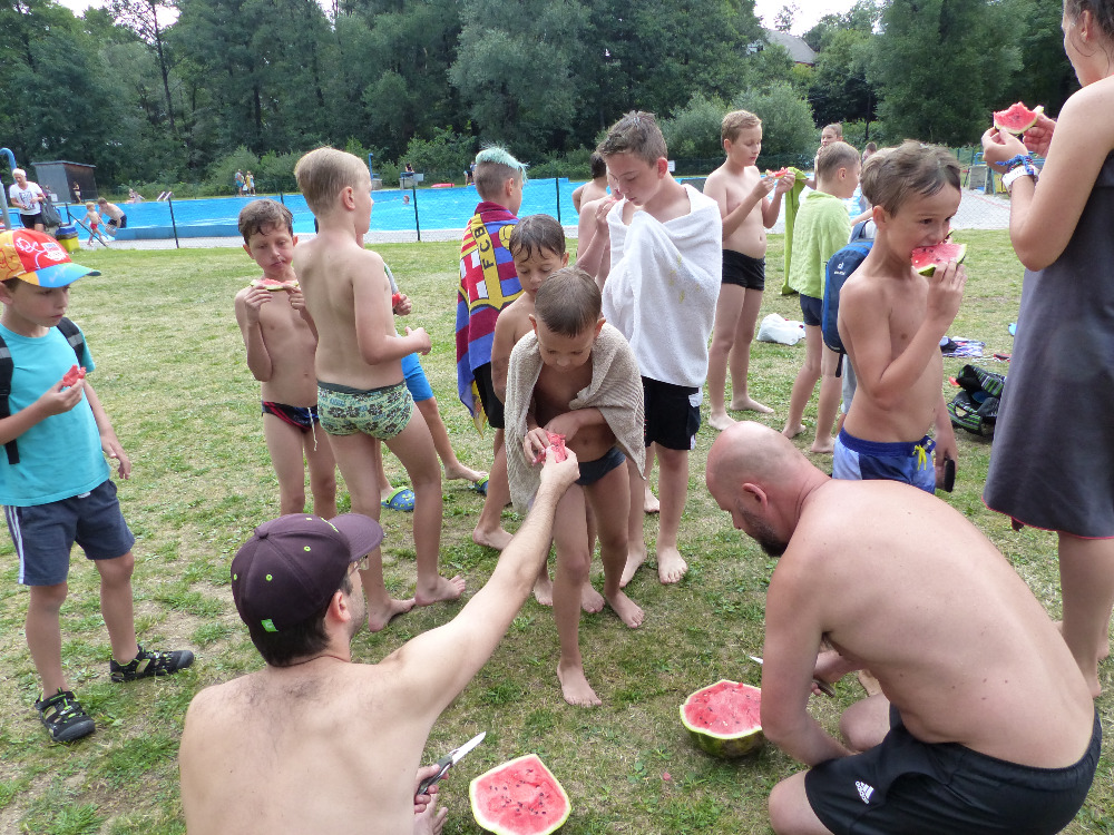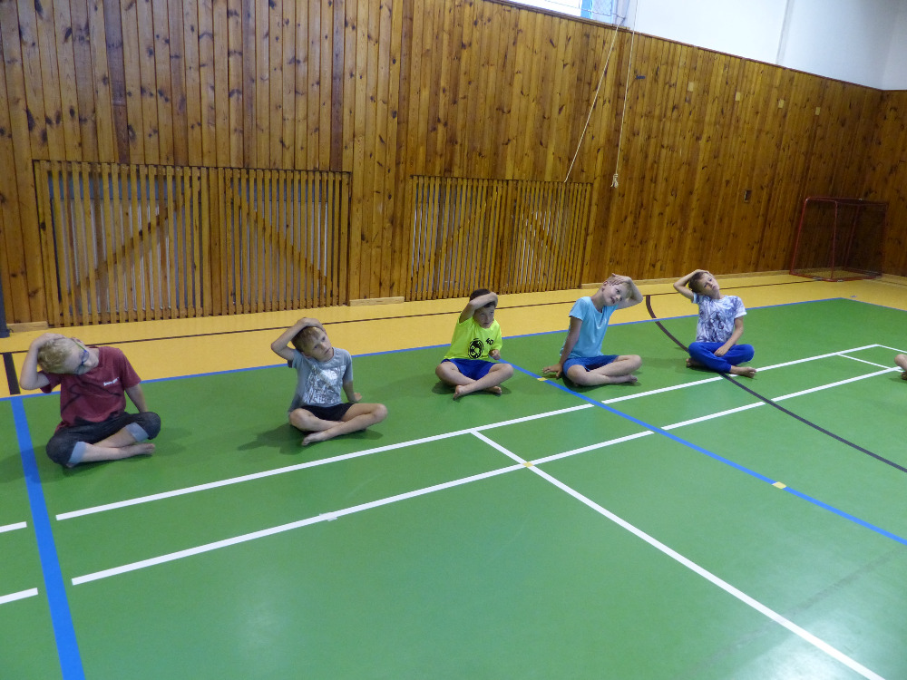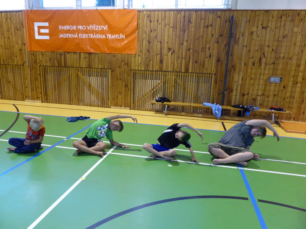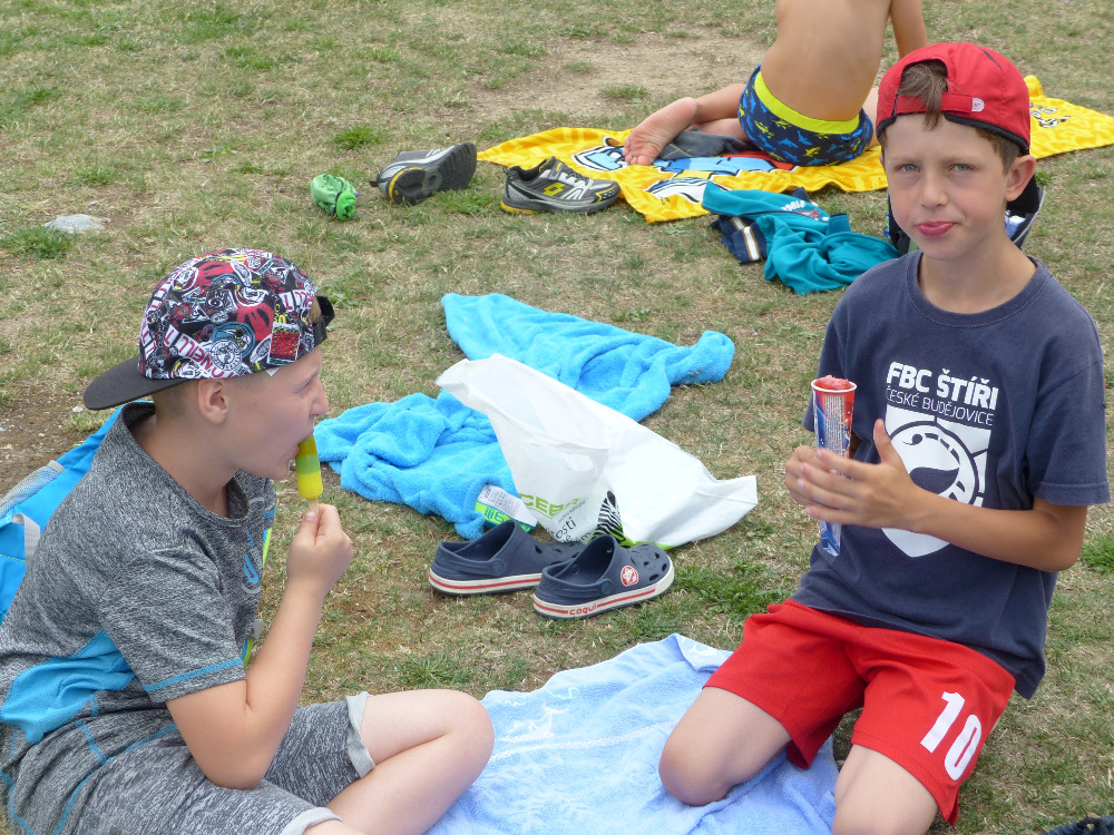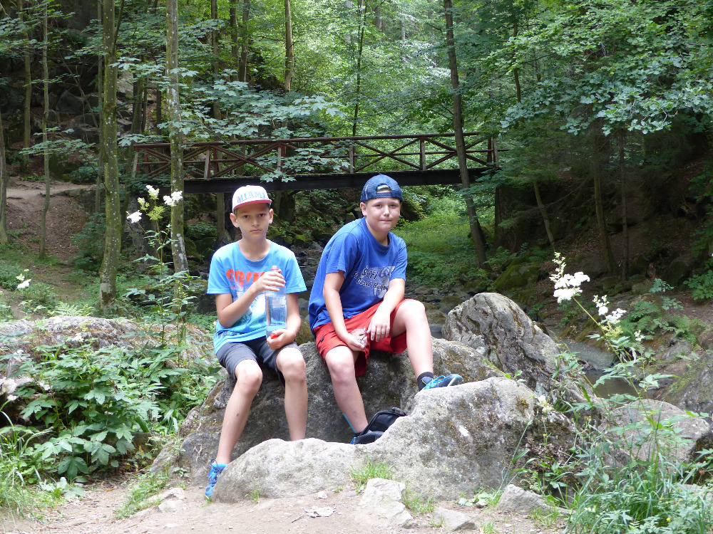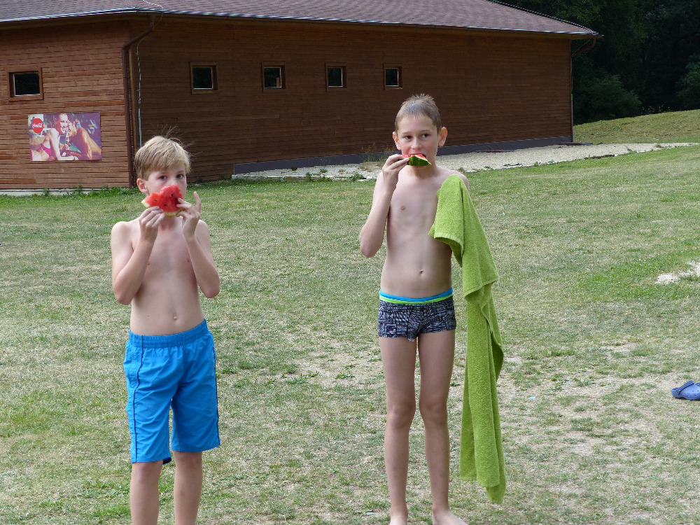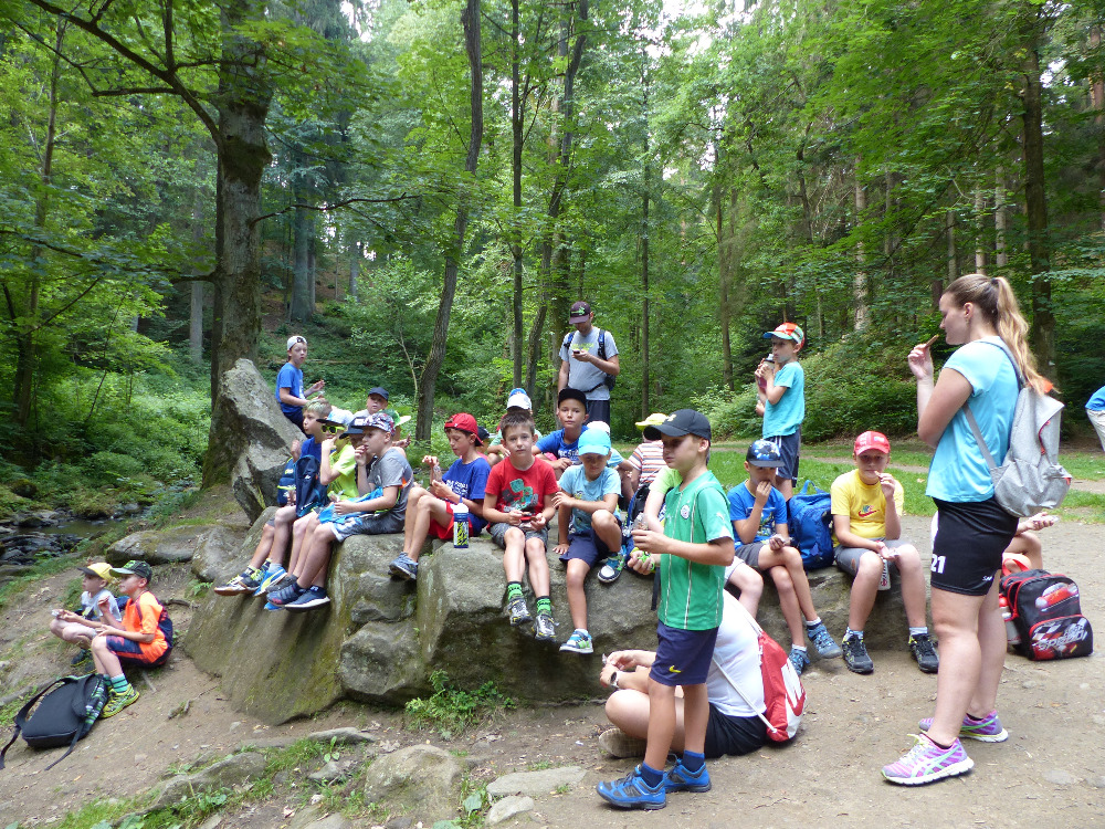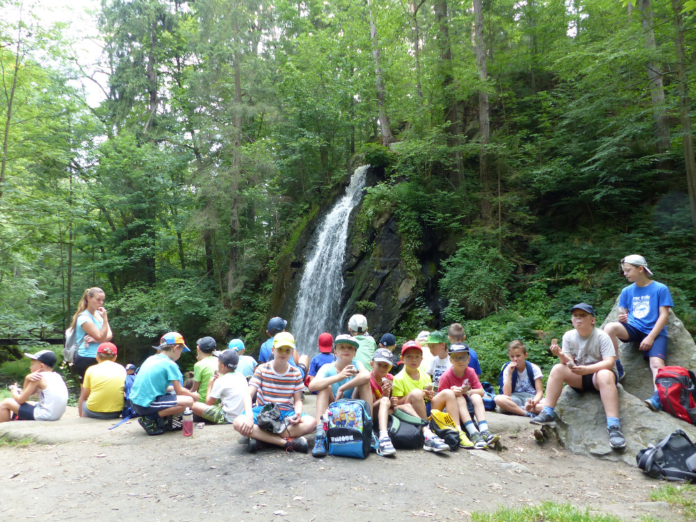 Prostřední den bývá na soustředění vyhrazen výletu. Tak jsme tentokrát hned po snídani vyrazili do Terčina údolí. Jako trenérská výpomoc dorazil Pavel Kouba. Svižnou tříkilometrovou procházku s jednou pauzou na pití zakončil pohled na známý vodopád. Jak už to u podobných exkurzí bývá, děti byly naprosto u vytržení z tohoto historicko-technického skvostu a přímo dychtily po informacích. Naštěstí bylo v okolí několik informačních tabulí, ale ani to mladým a všestranně založeným Štírům nestačilo. A tak vytáhla trenérka Anička z rukávu několik historek o rodu Buqoyů a nasytila svěřence mnoha novinkami, které se jim v životě jistě budou hodit. Pak jsme se občerstvili a vydali se na zpáteční cestu. Na trase jsme ještě zastavili u Vodního díla Humenice, které je zajímavé tím, že uprostřed má přistávací rampu pro létající talíře… Chvilička zbývala do oběda a tak ji pilní Štíři vyplnili úklidem svých buněk na základně, za což byli odměněni pochvalným pokýváním od trenérů. K obědu se servírovala uzená polévka s rýží (včera byla gulášovka, to jsem zapomněl napsat – pozn. aut.) a vepřové plecko s hausegemachte knödel z nějaké velkovýrobny. Při poledním odpočinku bylo znát, že ne všichni odpočinek potřebují, ale časový harmonogram určený šéftrenérem se musí dodržovat. Nebe sice hrozilo, že na nás vyleje pár kýblů vody, přesto jsme se rozhodli, že zkusíme štěstí a vyrazili jsme na koupaliště. Zde se ukázala jako vydatná posila Pavel, který pečlivě hlídkoval na břehu připraven lovit případné utopence. Jeho odborného zásahu nebylo naštěstí potřeba. A tak pomohl rozkrájet meloun jen těsně předtím než přišla slíbená sprška z nebe. Přesunuli jsme se tedy pod přístřešek a sportovcům bylo dovoleno mírně porušit životosprávu a zakoupit si něco v místním bufetu. Objednávka smaženého sýra s hranolkami a tatarkou trenéry zaskočila a tak se jali konzumaci mírně regulovat, neb krátce poté následoval odchod na večeři. Kuřecí řízky přesto padali do hladových úst jako pověstní Němci do krytu (brambory už vzdorovaly více) a mohlo se jít spokojeně na poslední fázi dne. Hra na schovávanou, vědomostní kvíz v rámci etapové hry, ale také posilovna a strečink s názornými ukázkami a vysvětlením všechny znavila. Někteří pak nepohrdli druhou večeří a po sprše všichni zapadli do postelí. Ve čtvrtek totiž pokračujeme!