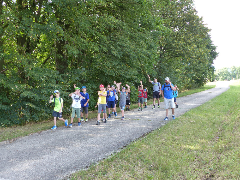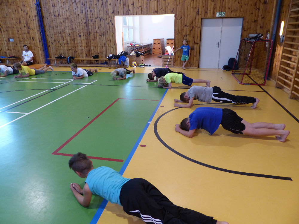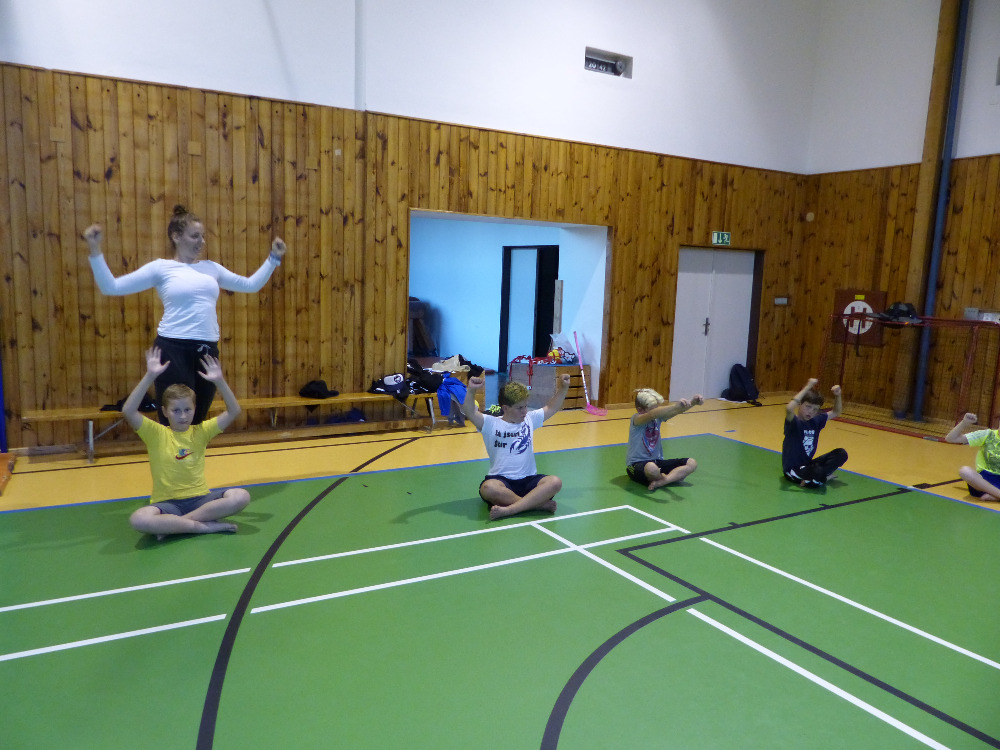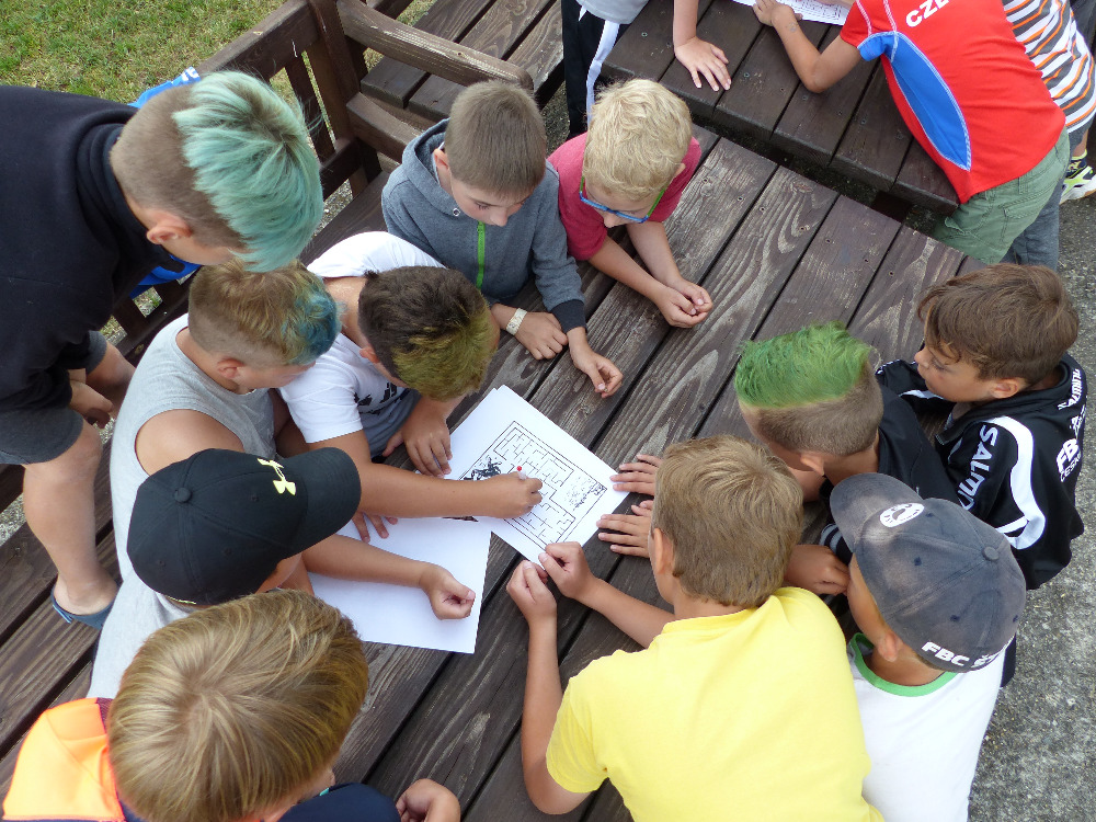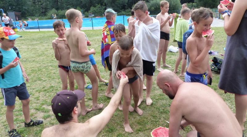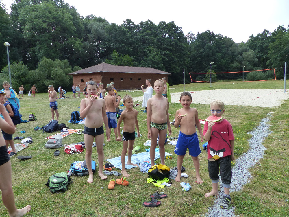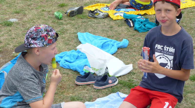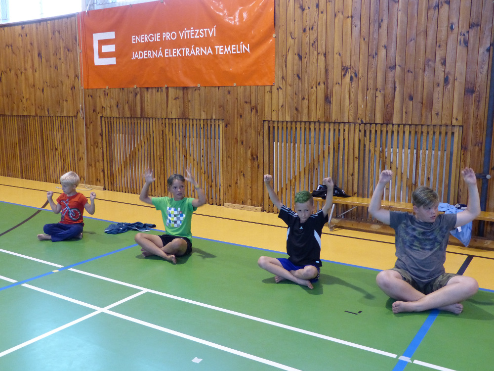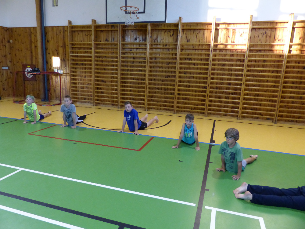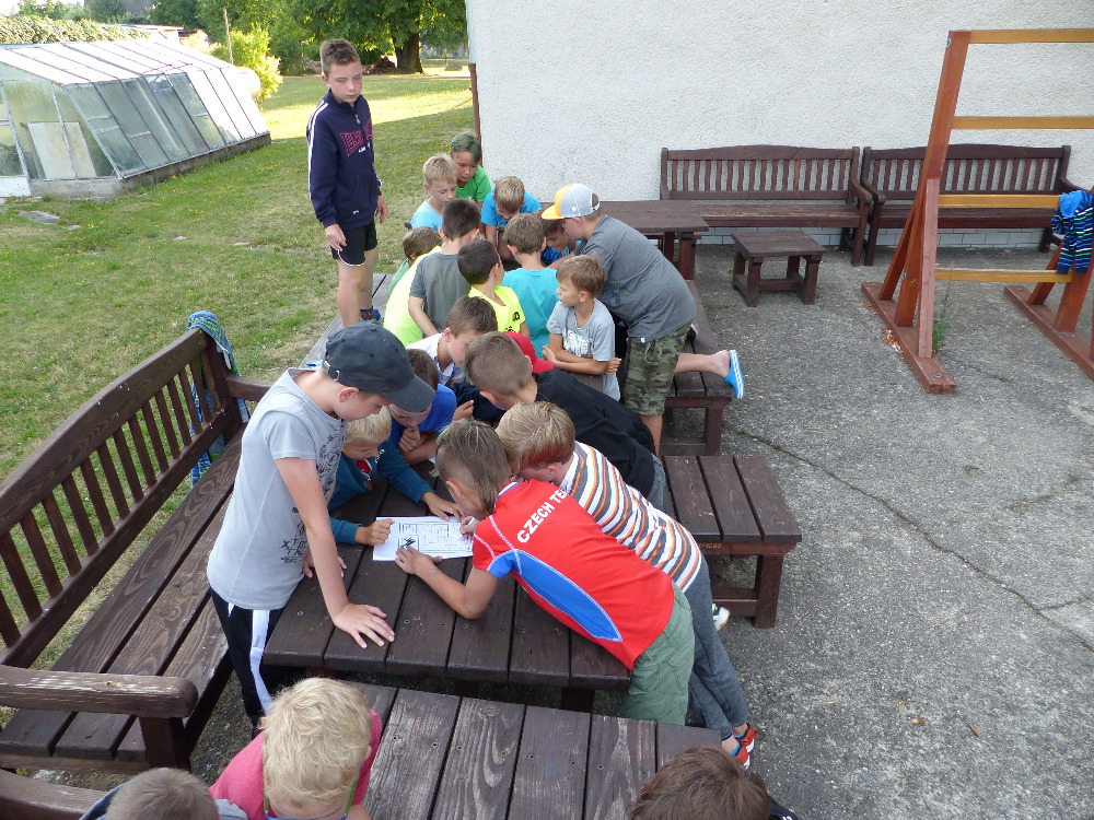 Prostřední den bývá na soustředění vyhrazen výletu. Tak jsme tentokrát hned po snídani vyrazili do Terčina údolí. Jako trenérská výpomoc dorazil Pavel Kouba. Svižnou tříkilometrovou procházku s jednou pauzou na pití zakončil pohled na známý vodopád. Jak už to u podobných exkurzí bývá, děti byly naprosto u vytržení z tohoto historicko-technického skvostu a přímo dychtily po informacích. Naštěstí bylo v okolí několik informačních tabulí, ale ani to mladým a všestranně založeným Štírům nestačilo. A tak vytáhla trenérka Anička z rukávu několik historek o rodu Buqoyů a nasytila svěřence mnoha novinkami, které se jim v životě jistě budou hodit. Pak jsme se občerstvili a vydali se na zpáteční cestu. Na trase jsme ještě zastavili u Vodního díla Humenice, které je zajímavé tím, že uprostřed má přistávací rampu pro létající talíře… Chvilička zbývala do oběda a tak ji pilní Štíři vyplnili úklidem svých buněk na základně, za což byli odměněni pochvalným pokýváním od trenérů. K obědu se servírovala uzená polévka s rýží (včera byla gulášovka, to jsem zapomněl napsat – pozn. aut.) a vepřové plecko s hausegemachte knödel z nějaké velkovýrobny. Při poledním odpočinku bylo znát, že ne všichni odpočinek potřebují, ale časový harmonogram určený šéftrenérem se musí dodržovat. Nebe sice hrozilo, že na nás vyleje pár kýblů vody, přesto jsme se rozhodli, že zkusíme štěstí a vyrazili jsme na koupaliště. Zde se ukázala jako vydatná posila Pavel, který pečlivě hlídkoval na břehu připraven lovit případné utopence. Jeho odborného zásahu nebylo naštěstí potřeba. A tak pomohl rozkrájet meloun jen těsně předtím než přišla slíbená sprška z nebe. Přesunuli jsme se tedy pod přístřešek a sportovcům bylo dovoleno mírně porušit životosprávu a zakoupit si něco v místním bufetu. Objednávka smaženého sýra s hranolkami a tatarkou trenéry zaskočila a tak se jali konzumaci mírně regulovat, neb krátce poté následoval odchod na večeři. Kuřecí řízky přesto padali do hladových úst jako pověstní Němci do krytu (brambory už vzdorovaly více) a mohlo se jít spokojeně na poslední fázi dne. Hra na schovávanou, vědomostní kvíz v rámci etapové hry, ale také posilovna a strečink s názornými ukázkami a vysvětlením všechny znavila. Někteří pak nepohrdli druhou večeří a po sprše všichni zapadli do postelí. Ve čtvrtek totiž pokračujeme!