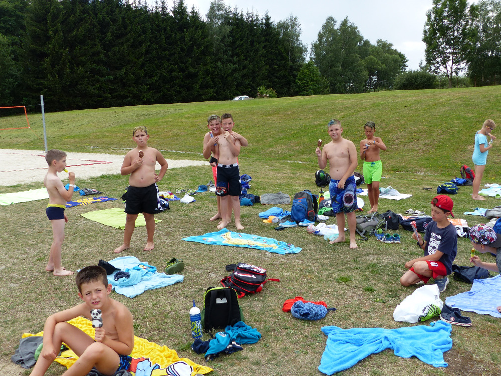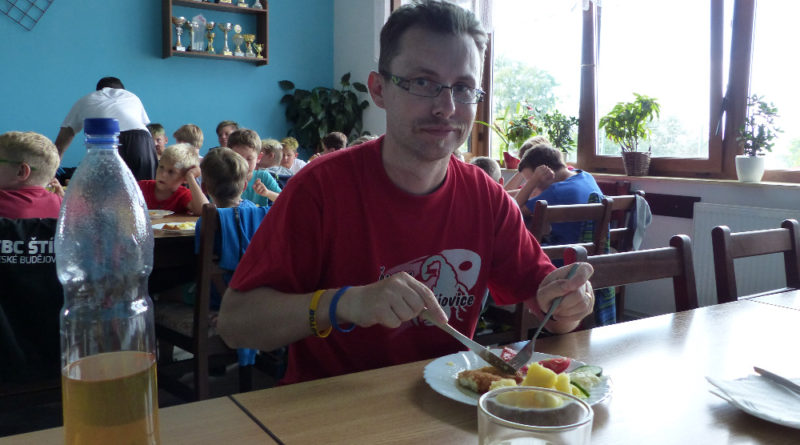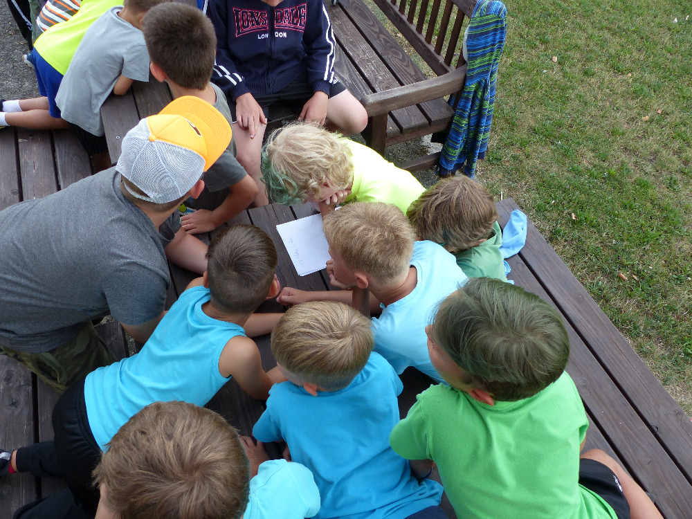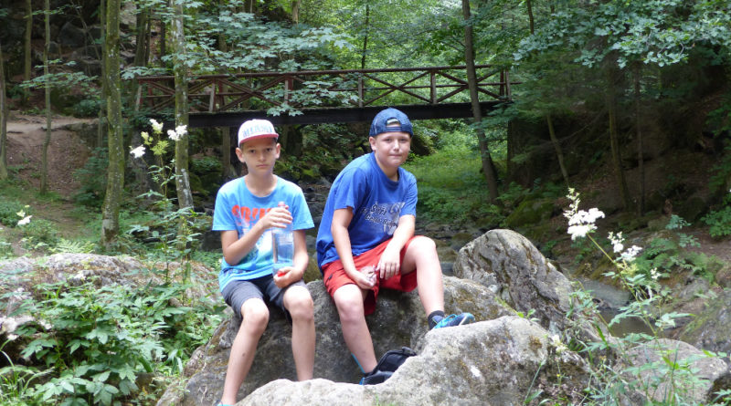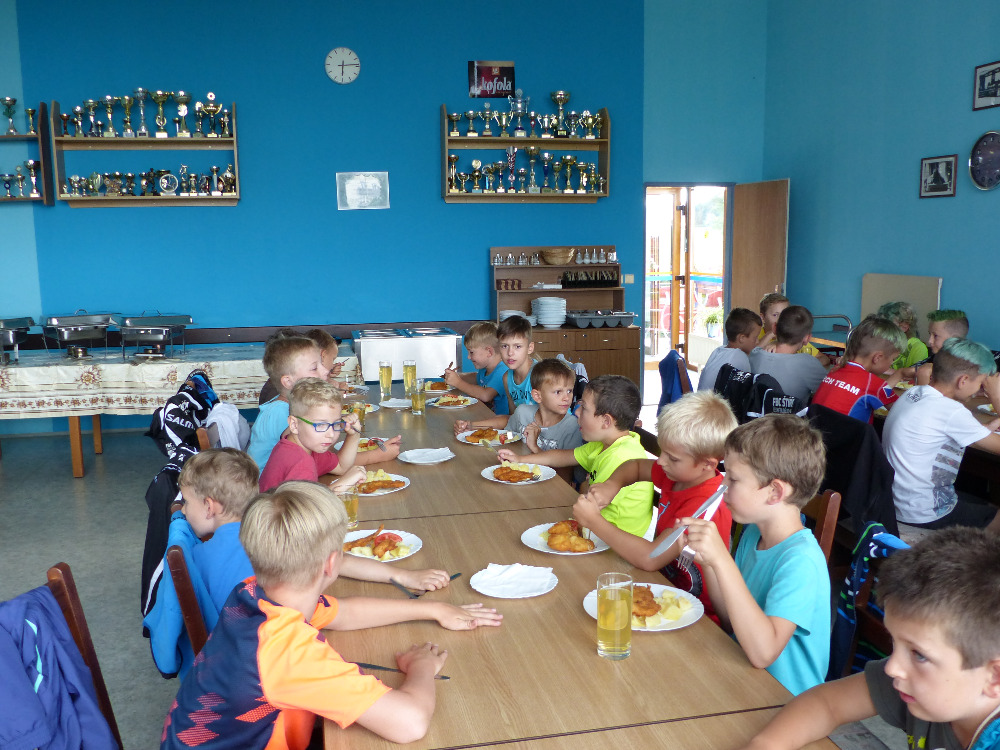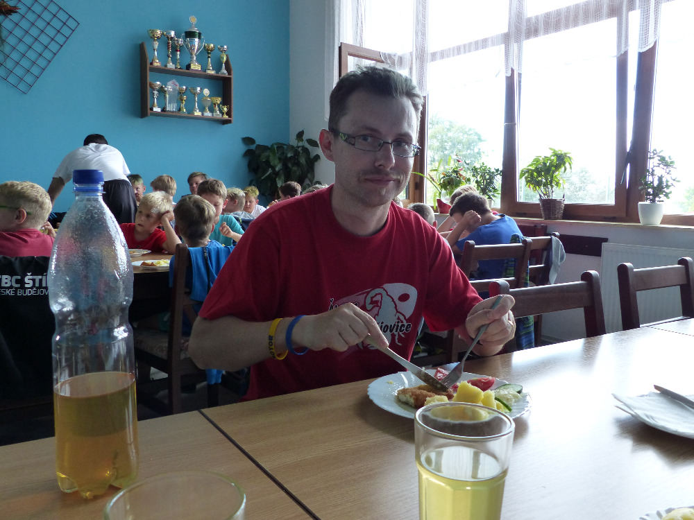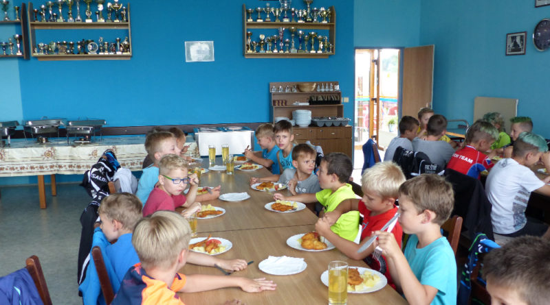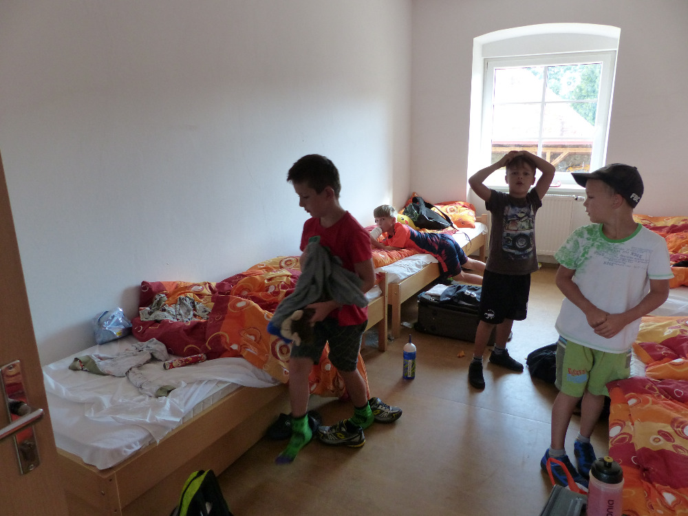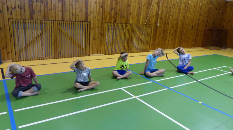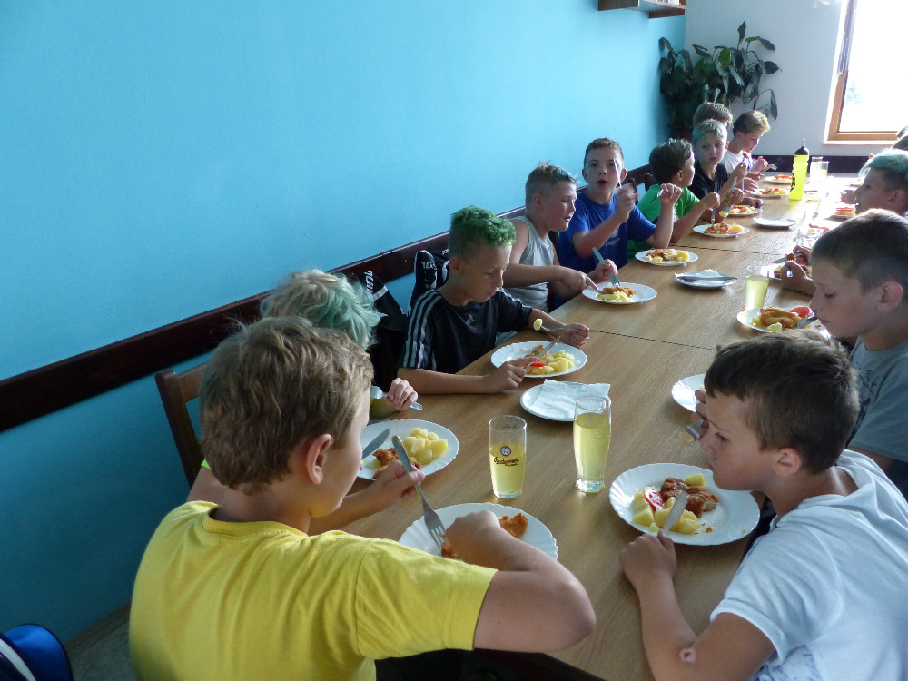 Prostřední den bývá na soustředění vyhrazen výletu. Tak jsme tentokrát hned po snídani vyrazili do Terčina údolí. Jako trenérská výpomoc dorazil Pavel Kouba. Svižnou tříkilometrovou procházku s jednou pauzou na pití zakončil pohled na známý vodopád. Jak už to u podobných exkurzí bývá, děti byly naprosto u vytržení z tohoto historicko-technického skvostu a přímo dychtily po informacích. Naštěstí bylo v okolí několik informačních tabulí, ale ani to mladým a všestranně založeným Štírům nestačilo. A tak vytáhla trenérka Anička z rukávu několik historek o rodu Buqoyů a nasytila svěřence mnoha novinkami, které se jim v životě jistě budou hodit. Pak jsme se občerstvili a vydali se na zpáteční cestu. Na trase jsme ještě zastavili u Vodního díla Humenice, které je zajímavé tím, že uprostřed má přistávací rampu pro létající talíře… Chvilička zbývala do oběda a tak ji pilní Štíři vyplnili úklidem svých buněk na základně, za což byli odměněni pochvalným pokýváním od trenérů. K obědu se servírovala uzená polévka s rýží (včera byla gulášovka, to jsem zapomněl napsat – pozn. aut.) a vepřové plecko s hausegemachte knödel z nějaké velkovýrobny. Při poledním odpočinku bylo znát, že ne všichni odpočinek potřebují, ale časový harmonogram určený šéftrenérem se musí dodržovat. Nebe sice hrozilo, že na nás vyleje pár kýblů vody, přesto jsme se rozhodli, že zkusíme štěstí a vyrazili jsme na koupaliště. Zde se ukázala jako vydatná posila Pavel, který pečlivě hlídkoval na břehu připraven lovit případné utopence. Jeho odborného zásahu nebylo naštěstí potřeba. A tak pomohl rozkrájet meloun jen těsně předtím než přišla slíbená sprška z nebe. Přesunuli jsme se tedy pod přístřešek a sportovcům bylo dovoleno mírně porušit životosprávu a zakoupit si něco v místním bufetu. Objednávka smaženého sýra s hranolkami a tatarkou trenéry zaskočila a tak se jali konzumaci mírně regulovat, neb krátce poté následoval odchod na večeři. Kuřecí řízky přesto padali do hladových úst jako pověstní Němci do krytu (brambory už vzdorovaly více) a mohlo se jít spokojeně na poslední fázi dne. Hra na schovávanou, vědomostní kvíz v rámci etapové hry, ale také posilovna a strečink s názornými ukázkami a vysvětlením všechny znavila. Někteří pak nepohrdli druhou večeří a po sprše všichni zapadli do postelí. Ve čtvrtek totiž pokračujeme!