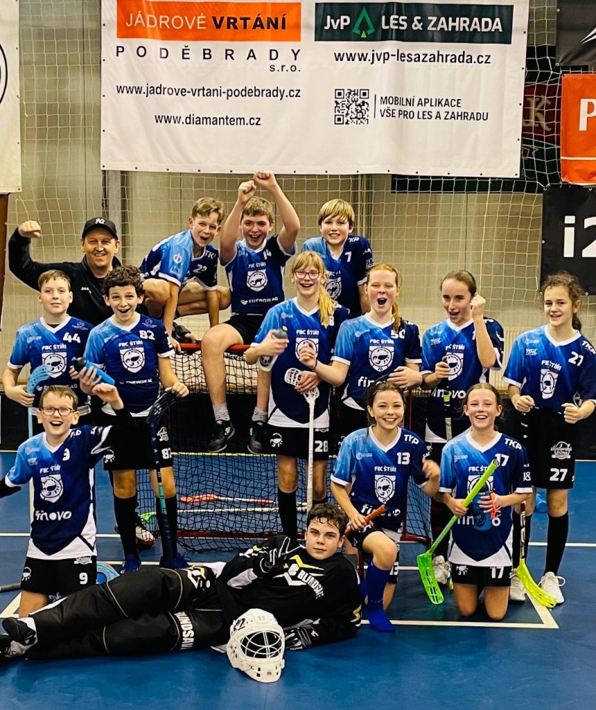 Následovala 15 minutová pauza a šlo se na derby s FA Č. Budějovice. Derby nikdo nechce prohrát a hra tomu odpovídala náš tým do zápasu vstoupil dobře a dlouho nepouštěl soupeře do šancí. Dokonce soupeře překvapil a šel do vedení. Další překvapení nastalo, když po poradě rozhodčích ( a fanoušků FA na tribunách ) byl gól odvolán. Náš tým to nezlomilo a za chvílí z trestného střílení vedl 1:0. V polovině utkání bylo skóre 4:1 pro Štíry a kluci a holky s překvapením zjistili, že pokud budou hrát aktivně a bez velkých chyb v obraně, tak se dá hrát s každým. V druhé půli došlo na vyloučení soupeře a místo toho, aby náš tým měl míček na florbalkách, tak se ho zbytečně zbavoval a soupeř dokázal vstřelit branku. I ve druhé půli dokázal každý tým několikrát skórovat a tam ukazatel skóre 2 minuty před koncem zápasu ukazoval 6:4 pro Štíry. Tlak týmu FA na snížení byl veliký a dokonce minutu před koncem vstřelil gól. Rozhodčí naštěstí gól neuznali pro postavení hráče v brankovišti a tak se náš tým mohl radovat zaslouženě z druhého vítězství.