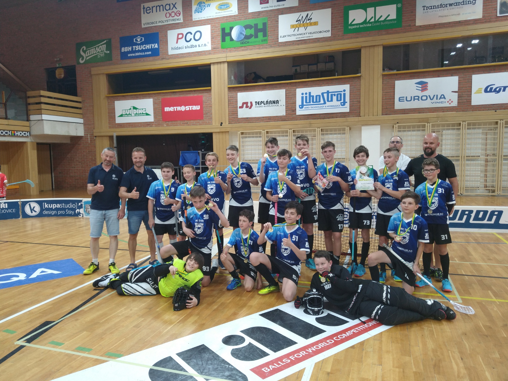 Turnajovou tabulkou zamíchalo překvapivé vítězství Písku nad Strakonicemi a klukům bylo jasné, že vzhledem k horšímu skóre by je prohra v posledním utkání odsunula na třetí místo. S ním se ovšem nechtěli spokojit ani dudáci, takže motivace nechyběla na obou stranách a bylo zaděláno na pořádné drámo. Začátek nám vyšel a soupeře jsme překvapili jeho vlastní zbraní – gólem z volného úderu. Strakoničtí se ovšem zaskočit nenechali a nachystali nám lekci z produktivity. Téměř každé naše zaváhání v obraně nebo rozehrávce dokázali potrestat a v polovině utkání svítil na ukazateli skóre stav 1:3. Straky byli na koni a klukům začalo vytoužené zlato mizet v bronzovém oparu. Recept tu ovšem byl. První lajnu, která vždy dostávala soupeře pod tlak, posíláme na hřiště každé druhé střídání a jako mávnutím kouzelného proutku se obraz hry mění. Teď už se více hraje na polovině červených, zvedají se i naše další formace, střídačka žije a všichni věříme, že poraženi neodejdeme. Do přestávky snižujeme a tempo držíme i na začátku třetí třetiny. Adam Buzek nabíhá z pozice obránce do velkého brankoviště a nádhernou souhru celé lajny zakončuje backhandem z první. Áďa slaví hattrick, je srovnáno. Ovšem ne nadlouho. Náš torpédoborec má ještě pod kotlem dostatek páry a jeho kapitán Ondra Hajný zasouvá do komory další torpédo, které proplouvá červenou obranou a exploduje v síti. Minutu a půl před koncem přichází nečekaná komplikace v podobě špatného střídání. Jdeme do čtyřech a soupeř do šesti. Abstinenti zavírají oči, ti ostatní otvírají ploskaně. Dlouhé sekundy Štíři zkušeně drží míček za svatyní Johnyho Bicana, několikrát úspěšně vyhodí, ale přece jen přichází chybička, soupeř natahuje ke střele…., ale v tu chvíli je bubínky trhající klakson naší sportovky tím nejkrásnějším zvukem a na naší půlce propuká obrovská radost.