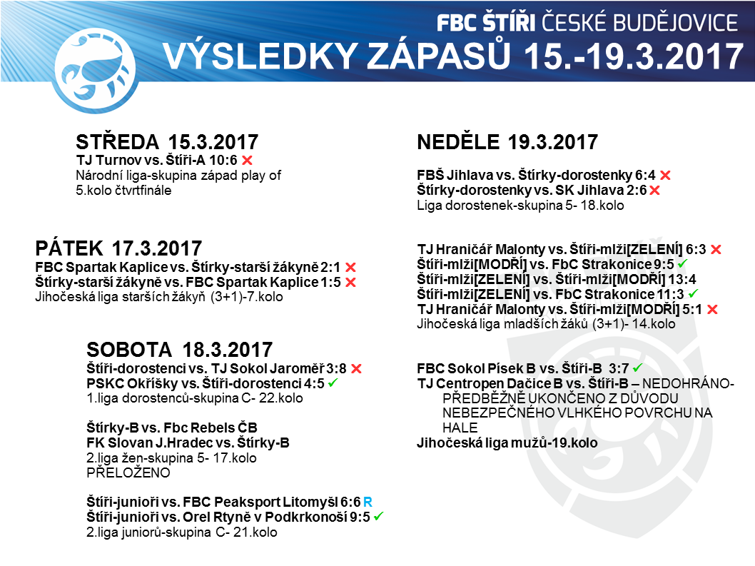 Junioři zaznamenali v Hradci Králové výhru 9:5 nad celkem Orel Rtyně v Podkrkonoší a remízu 6:6 s FBC Peaksport Litomyšl. Celkově se tak Štíři umístili na krásném 2. místě 2. ligy juniorů a čeká je play off! V tom změří síly s Florbalovou školou Jihlava již tuto sobotu!
