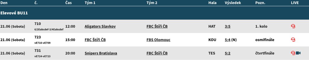 Komentář Radka Stehlíka: „Ve čtvrtek ráno jsme se vydali do Brna. Cesta byla poměrně dlouhá, kvůli výluce nás čekali dva přestupy, ale vše jsme zvládli dobře. Hned po příjezdu nás čekal první zápas skupiny proti Aligators Slavkov, který se nám úplně nepovedl, ale kluci i holky dokázali zabrat, ale ani tak nám to výhru nepřineslo. V pátek nás čekali celkem 3 zápasy, první úspěšný zápas s Draci Říčany 4:1. Protože jsme mezi zápasy měli dlouhé pauzy, vyrazili jsme na Výstaviště, kde bylo hlavní dění celého turnaje a koukli se na zápas našich juniorů. Po přesunu zpět do haly nás čekal zápas s Gullivers White, který jsme prohráli 1:6. Následovala další pauza, a tak jsme ji využili a zahráli si minigolf. Posledním zápasem skupiny byl FBC Intevo Třinec a prohra 4:6. I když se nám ve skupině úplně nedařilo a skončili jsme 4., tak v sobotu nás čekali zápasy v play-off. První zápas play-off jsme hráli opět s našim prvním soupeřem, tedy Slavkov, ale tentokrát jsme ho vyhráli my 5:3, takže jsme šli do osmifinále. Tam jsme hráli proti FBŠ Olomouc. Tento zápas byl jedním z našich nejlepších. Byl to velmi povedený zápas, který jsme vyhráli na nájezdy, po gólu “Davída”, ale i zásluhou všech hráčů a především výborným výkonem našeho gólmana. Večer nás čekal zápas ve čtvrtfinále proti Snipers Bratislava, který nám bohužel nevyšel, prohra 2:5 a konec turnaje. I přes vypadnutí jsme výsledek pořádně oslavili a myslím si, že jsme si celý turnaj moc užili a nasbírali zkušenosti. Hrálo se totiž 5+1 a měli jsme pouze tři tréninky na změnu z 3+1, což jsme hráli celou sezonu. Zvládli jsme to tedy velmi dobře. Děkujeme i za doplnění sestavy dvěma hráčkami a moc děkujeme všem za skvělý výkon a také rodičům za skvělou atmosféru.”