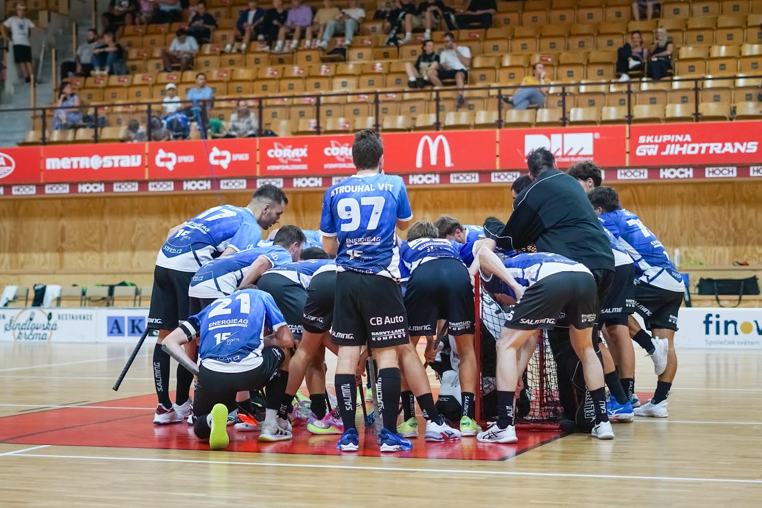 Českobudějovičtí florbalisté slaví první sezonní výhru. Po urputném boji přetlačili Orku 7:6.