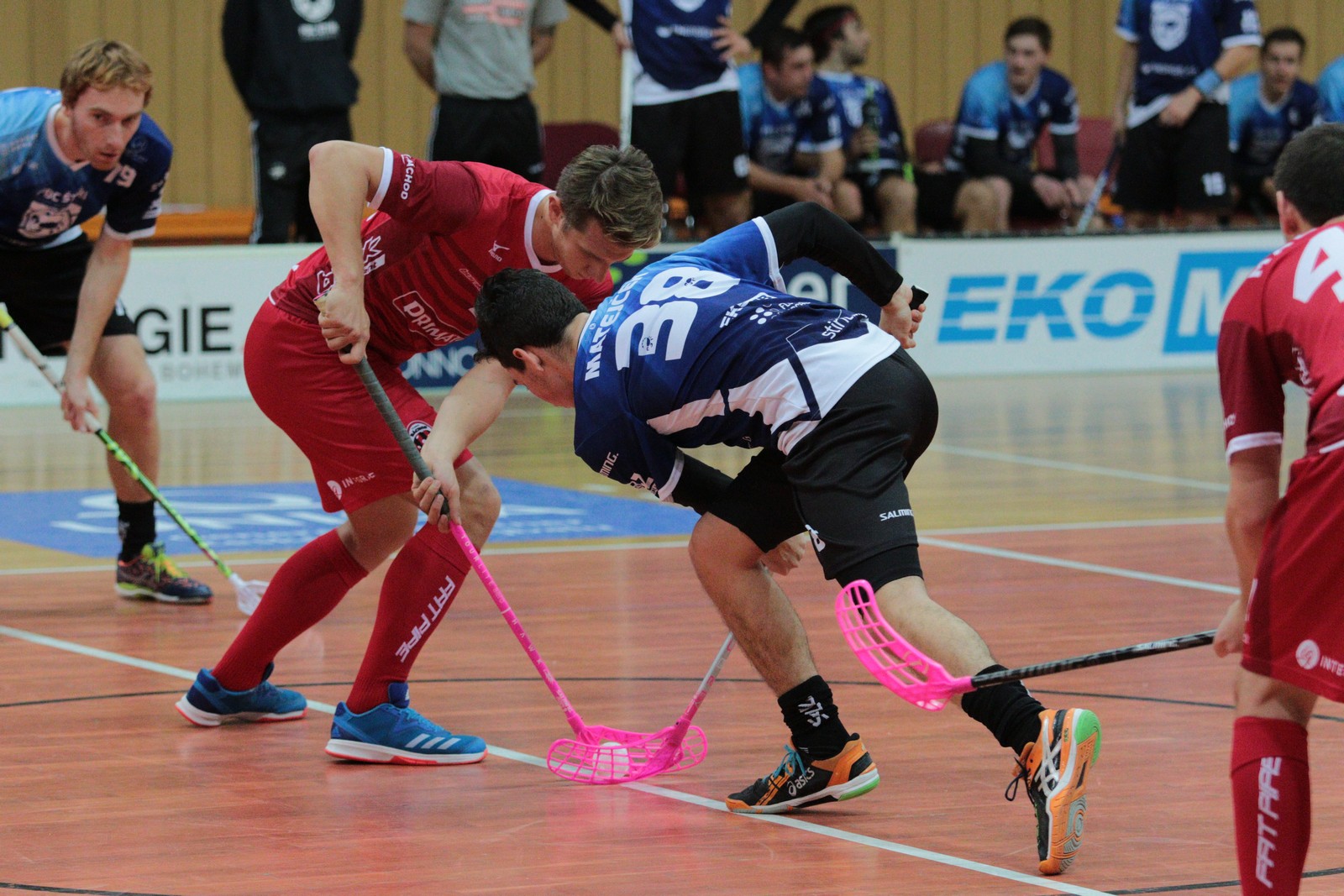 Na začátku druhé periody za úřadovali opět domácí. Jihočeši si vytvářeli tlak,ale žádná ze střel si nenašla cestu mezi tři tyče. Naopak nepřesnosti Jihočechů domácí hráči trestali a zvýšili na 6:3. Za pouhých 8 vteřin se míčku zmocnil Slepička a snížil. Netrvalo dlouho a Štíři vsítili další gól, Hanák si pohrával s míčkem za bránou domácích a neskutečně zakončil. Ve 35. minutě Králík vyrovnal a zápas mohl začít znovu. Bohužel vedení strhli na svoji stranu opět domácí a do šaten se šlo za stavu 7:6.