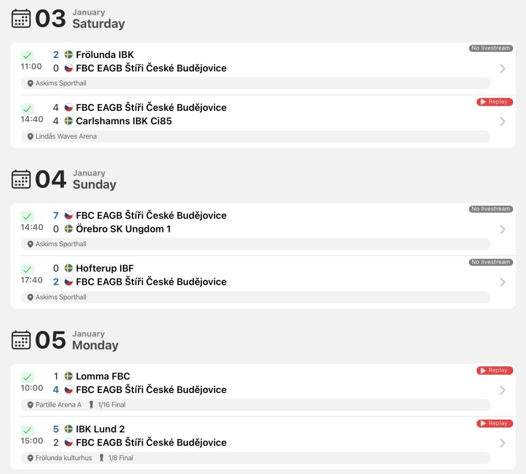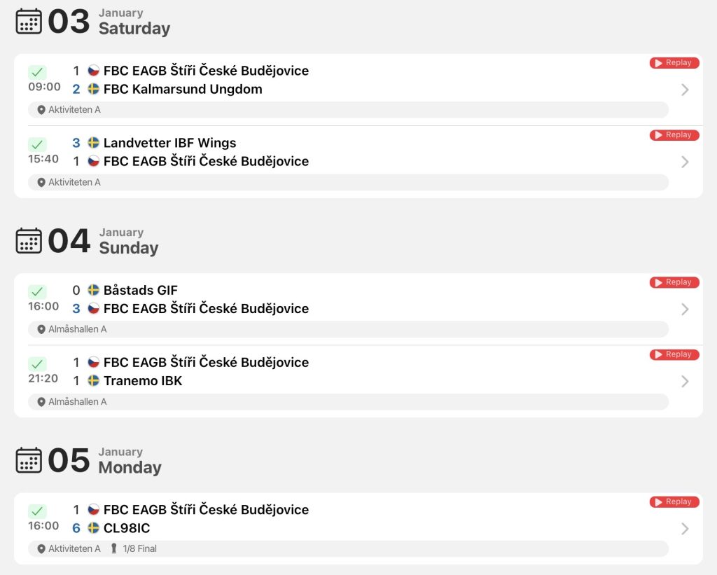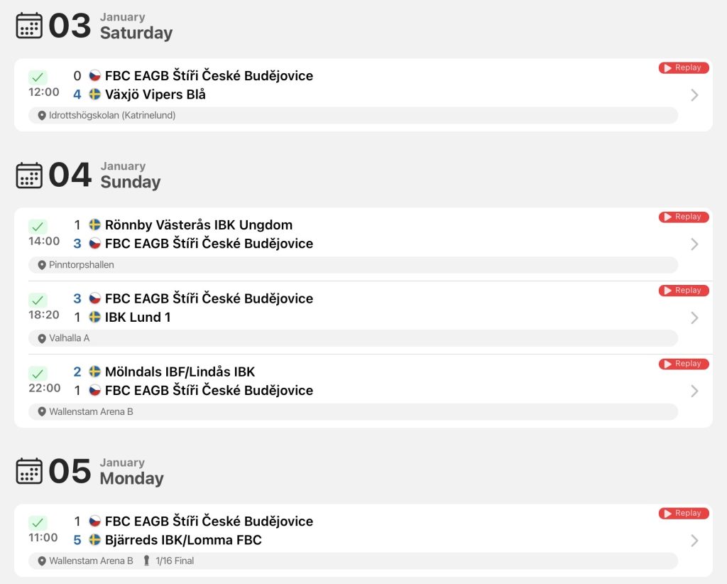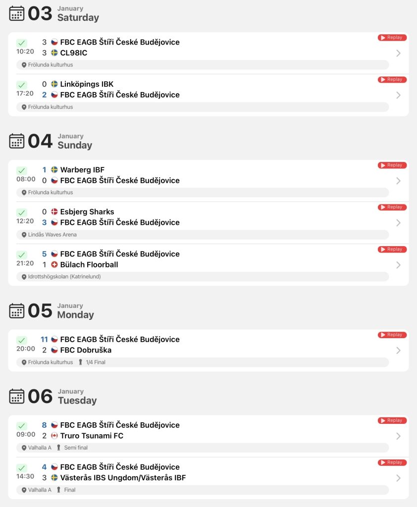Hodnocení trenéra B17 Pavla Capla: „Odpočatí po svátcích v neúplné sestavě jsme do turnaje vlétli, když jsme vedli 3:0 nad velmi kvalitním Cl98icem (semifinalista play-off A). Utkání jsme si bohužel nechali vyrovnat 2 sekundy před koncem na 3:3 a tyhle ztracené body se nakonec ukázaly jako klíčové. Kvalitně jsme hráli po celou dobu turnaje, když jsme zkušeně odkontrolovali vítězství proti dalšímu ze švédských týmů. Další den jsme se utkali s Warbergem IBF (vítěz play-off A). Tam jsme nedokázali vstřelit branku a soupeř využil jediného našeho zaváhání. Výsledek 0:1 tedy znamenal, že postup do play-off A není v našich rukou. To tým ale rozhodně nezastavilo a kluci zapsali dvě další výhry. Nejdříve s dánským a poté švýcarským týmem. Favorité ale nezaváhali, a tak nás o bod čekal pavouk B. Tam byl cíl od začátku jasný, vítězství. To se nakonec po dalších dobrých výkonech podařilo. V cestě jsme si poradili s Dobruškou, poté s jediným kanadským týmem na turnaji a ve finále jsme zvládli i emočně vyhrocenou bitvu proti švédskému týmu. Turnaj tak i přes nepostup do play-off A rozhodně splnil mé očekávání a myslím, že jsme si ho všichni užili. Chtěl bych vyzdvihnout, jak se celý tým dokázal popasovat s tvrdší hrou a volnějším metrem sudích, to je myslím něco, co nám nakonec vyhovuje. Naši hru také zdobila celková bojovnost a urputnost, což je recept, který používáme i efektivně v lize. A v neposlední řadě také skvěle zvládnutý systém. Reklamou na něj je zápas ve skupině proti Bülachu. Oslavy s pohárem byly velmi příjemné, ale teď je náš focus zase zpět na ligu. To jsme potvrdili už o víkendu v Plzni. Teď to musíme zase dokázat ve dvojzápase s pražským Olympem. Na konec bych chtěl všem juniorům poděkovat a vzkázat, že tímhle naše sezónní cíle rozhodně nekončí! Také děkuji čtyřem dorostencům, kteří po vypadnutí doplnili náš tým.”