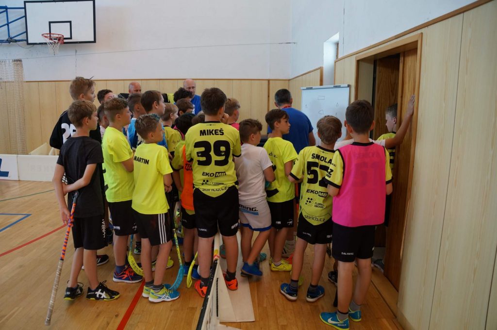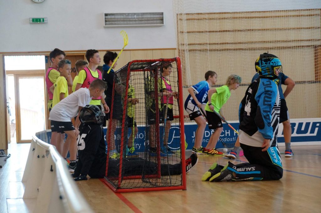 Poté starší čekal program v hale. Pilovali se indivinduální umění hráčů. Pak následoval další turnájek. Tým Nou čips posilnění Lukášem Malým si vybojoval vítězství. Mladší u školy trénovali osobní souboje. A v hale florbalové dovednosti.