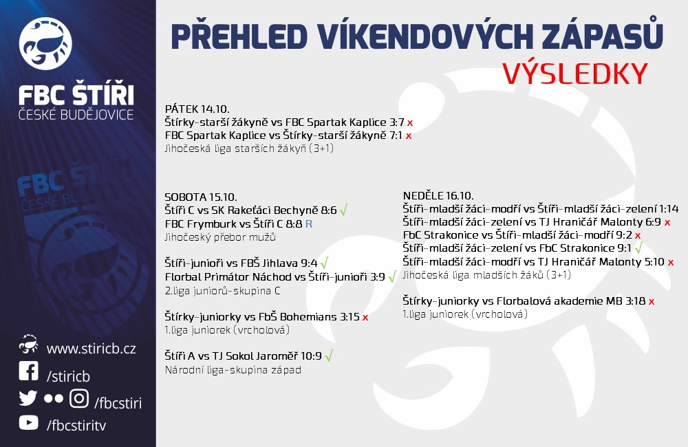 Tento týden byl pro Štíry hektický: 2x jsme narazili na Bohemku a dostali od ní 2x 15 gólů; starší žákyně v pátek večer obdržely 2x 7 branek od Kaplice; v sobotu Štíři-C naopak 2x 8 gólů nadělili, Junioři byli ještě úspěšnější a vsítili 2x 9 gólů, Áčko mužů si to nechtělo nechat líbit a vyhrálo 10ti brankami. V neděli zahájili ligovou sezónu 2 družstva mladších žáků – každé třemi zápasy a odpoledne juniorky neuspěli ani v 5. kole 1.ligy.