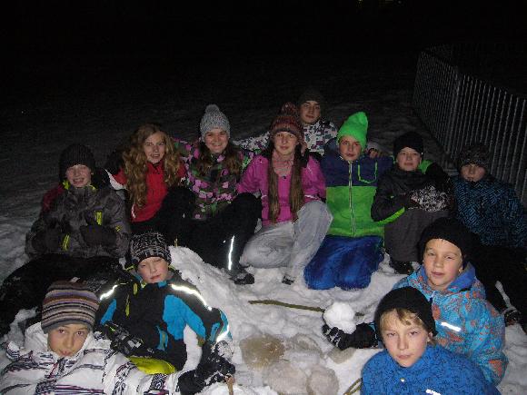Po skončení jsme se přesunuli do společenské místnosti, kde si pro nás Honza Novotný připravil zajímavou přednášku o pravidlech florbalu a o mužích, kteří rozhodují o osudech hráčů, tedy o rozhodčích. K večeři jsme měli vynikající špagety. Večer ještě proběhla soutěž o nejhezčího sněhuláka mezi týmy. Nejprve jsme se všichni začali koulovat, válet ve sněhu, shazovat se do sněhu, ale pak (tak po půlce možného času na naše výtvory) jsme museli jít začít se stavbou. Všichni jsme si stoupli do kruhu a začali si o tom povídat a napadlo nás udělat pohromadě jednu velkou stavbu (tři sopky) za každý z týmů, ale všechny jsme pospojovali a tato stavba měla symbolizovat spojení mezi jednotlivými týmy v jeden celek a jednu skvělou partu, která se na tomto soustředění sešla.
